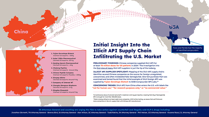 Partner research traces a pattern in which active pharmaceutical ingredients (APIs) for GLP‑1s are sourced from multiple overseas manufacturers, routed through intermediaries, and sold to U.S. compounders and gray‑market vendors. Some shipments are labeled “research use only/not for human use,” yet end up in products marketed to patients. At the point of sale, these products often appear as multi‑dose vials that require self‑measured dosing, are missing standardized patient labeling, and may lack consistent identifiers (e.g., lot numbers, NDCs, or clear expiration dates). This pathway increases the risk of poor quality, contamination, and dosing errors.